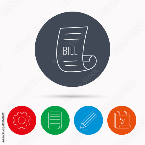 bill, billing, pay, bank, document, tax, debt, business, invoice, finance, price, account, credit, receipt, payment, money, eatery, office, financial, international, cash, change, total, paid, balance, icon, signs, symbol, flat, linear, line, outline, concept, design, vector, badge, seal, logotype, mark, stamp, cogwheel, cog, wheel, file, crayons, calendar, edit, service, setting