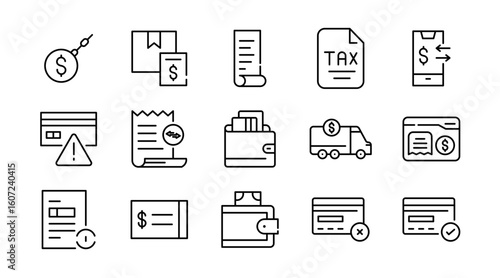 payment, bill, invoice, receipt, finance, banking, money, credit card, cash, transaction, dollar, online, statement, accounting, bank, document, pay, billfold, purchase, tax, savings, money transfer, investment, qr code, fingerprint, calculating machine, electronic, financial, management, budgeting, expense, method, processing, phone, terminal, check, symbol, credit, exchange, form, price, tool, outline, line, set, icon, vector