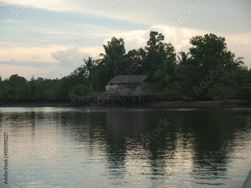 Bintan island river sunset scenery with traditional Stilt house, Indonesia