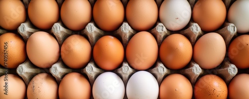 BIO fresh chicken eggs in paper box in supermarket, food protein healthy food banner. Generative Ai.