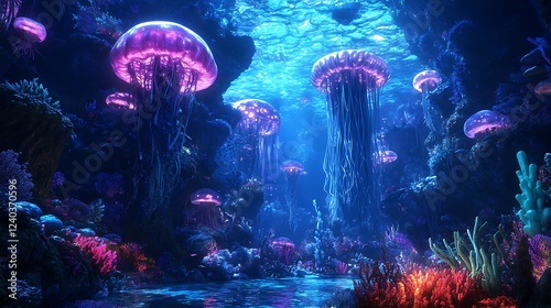 jellyfish, bioluminescence, sea, ocean, deep, canyon, coral, reef, underwater, dark, blue, purple, pink, glow, light, water, aquatic, life, marin, environment, nature, fantasy, illustration, digital, art, beautiful, calm, serene, mystic, magical, dreamy, surreal, vibrant, colours, high-coloured, glowing, luminescence, illuminated, shadow, contrast, texture, depth, perspective, mystery, enigma, wonder