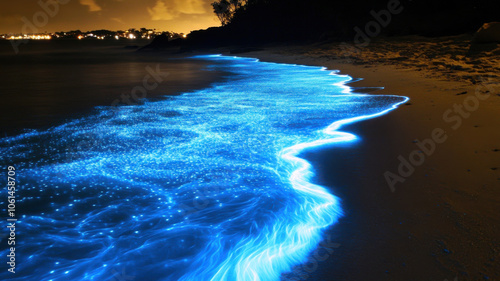 Bioluminescent waves glow blue along beach, creating magical scene at night. shimmering light reflects on water, enhancing serene atmosphere