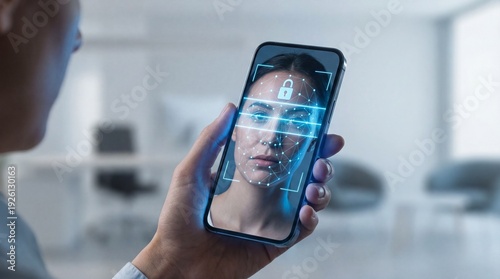 face, recognition, biometric, scanning, security, identity, smartphone, digital, scan, interface, modern, screen, device, portrait, facial, person, scanned, held, hand, phone, display, sophisticated, mesh, overlay, line, node, lock, icon, cool, highlighting, contour, glowing, background, minimalist, office, setting, create, experiencing, sharp, sharpened, interaction, protection, corporate