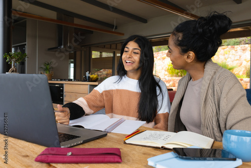 Biracial mother looking at teenage daughter studying over laptop on table at home