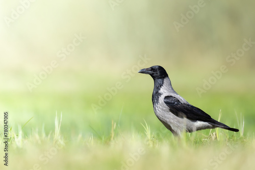 Bird - Hooded crow Corvus cornix in green meadow spring background Poland Europe