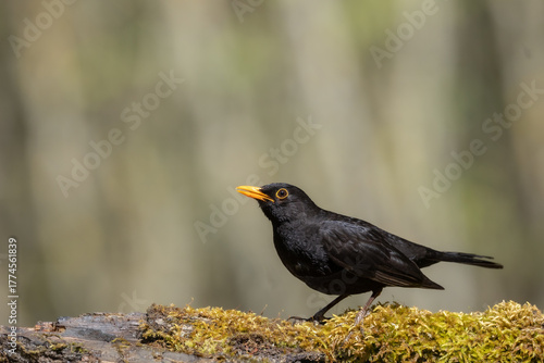 Bird - male Blackbird Turdus merula on the forest grassland amazing warm light sunset sundown