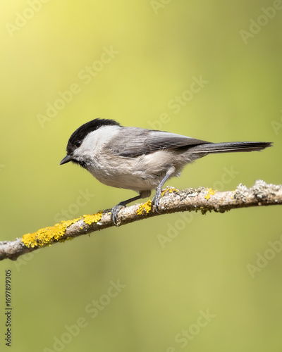 Bird - Marsh Tit ( Poecile palustris ) perched on tree spring time small bird on light background forest in Poland Europe