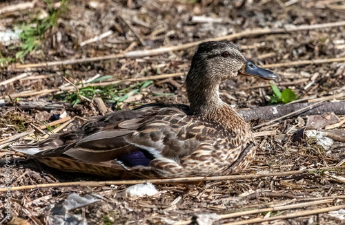 Bird duck mallard on the background of dry grass close up in summer