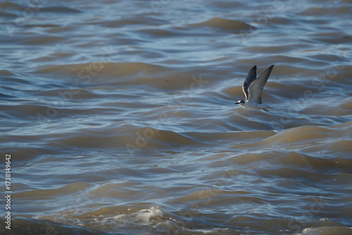 Bird flying over the Black Sea, Georgia. Little tern soaring above the azure sea. Tern and waves. White Winged Tern in flight. Selective focus.