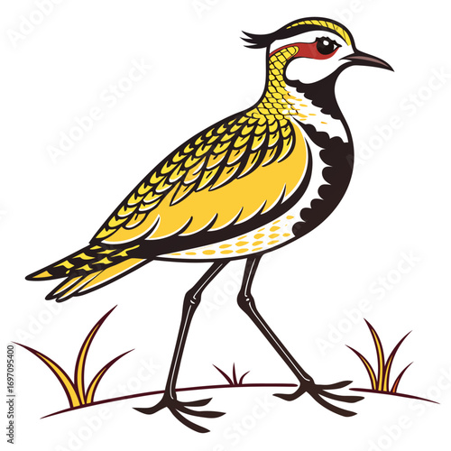 bird, wildlife, animal, nature, flight, wing, feather, beak, eye, head, body, tail, yellow, black, red, outline, graphic, drawing, art, design, symbol, avian, ornithology, creature, grass, ground, field, meadow, forest, tree