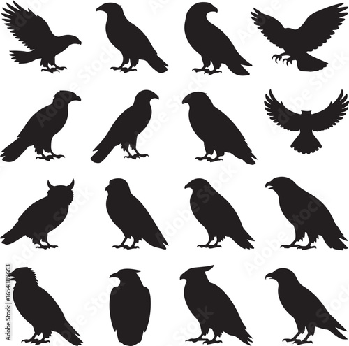 bird, eagle, owl, hawk, hawk, bird of prey, bird of prey, silhouette, flying, perched, avian, wildlife, nature, illustration, vector, graphic, design, collection, set, black-and-white, isolated, white background, drawing, art, creature, predator, hunting, soaring, majestic