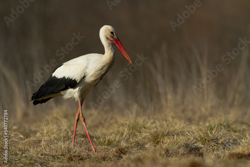 Bird White Stork Ciconia ciconia hunting time early spring in Poland Europe