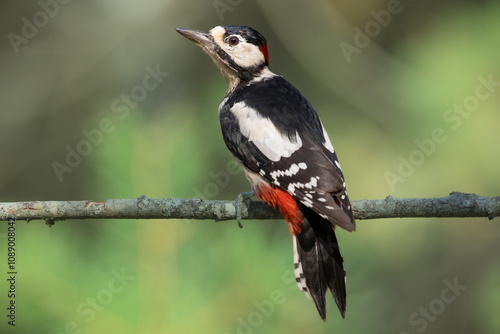Birds - male Great spotted woodpecker - Dendrocopos major, woodpecker sitting on a tree trunk, autumn time in forest pond bird drinking water