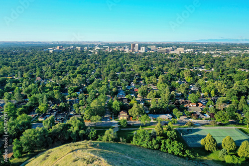 beautiful, skyline, urban, city landscape, drone, birds eye view, panorama, landscape, sky, city, view, town, panoramic, village, green, house, nature, blue, architecture, travel, tree, building, tree, tour tourism, idaho, downtown, business building, aerial, summer