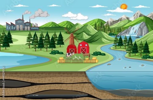 Birds eye view of nature farm landscape in cartoon style