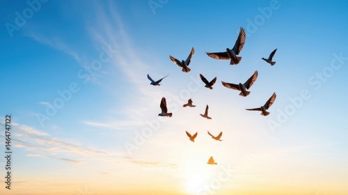 bird, pigeon, dove, flying, sunset, sunrise, sky, cloud, freedom, peace, nature, wildlife, animal, flock, group, silhouette, avian, feathered, wing, fly up, serenity, calmness, hope, journey, travel, migration, beautiful, colourful, vibrant, golden hour, landscape, background, wallpaper, banner, image, photograph, photo, peaceful, calm, bright, light, sun, horizon, evening
