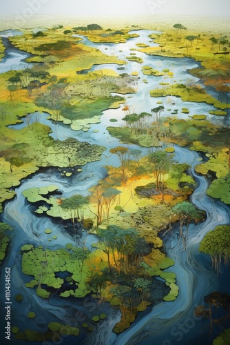 swamp, light, abstract, nature, sky, environment, illustration, plant, aerial, painting, perspective, forest, river, wood, tree, lake, spring, colourful, summer, tour tourism, picture, grass, wetland, view, texture, pattern, green, watercolor, landscape, scenery, yellow, art, drawing, background, park, water, bright, drone, scenic, beautiful, travel