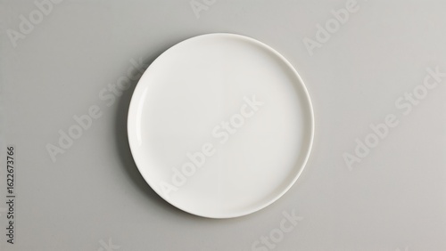 Bird's-eye shot of a sleek, low-rimmed round plate set on a muted gray background