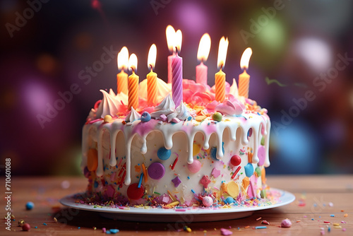 Birthday cake with candles on a festive elegant background. Generative AI.
