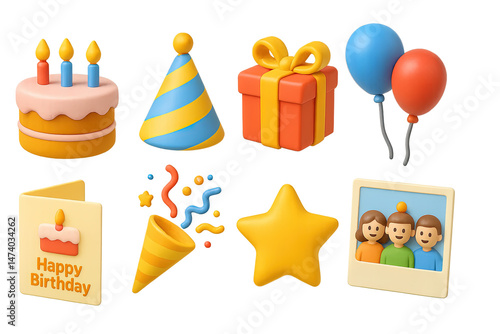 birthday, celebration, party time, three-dimensional, vector, icon, set, design, party, festive, joyful, creative, element, cake, balloon, gift, hat, invitation, fun, colourful, decoration, theme, holiday, anniversary, event