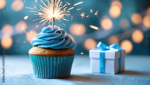 Birthday cupcake featuring a lit sparkler and a present on a light blue table with blurred lights in the background