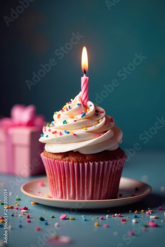 Birthday cupcake with candle, small gift box nearby , birthday, delicious, pastel