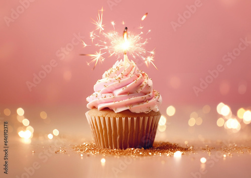 Birthday cupcake with sparkler and sprinklers on pink background.Macro.AI Generative