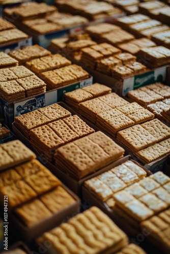 Biscuit and cracker snacks stacked neatly