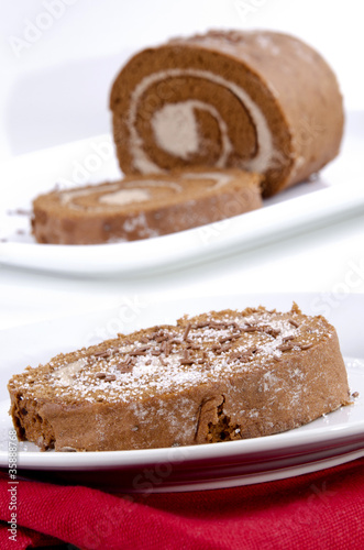 dessert, food, role, pie, sweet, chocolate, sugar, fresh, baked, tasty, stuffing, detail, close-up view, white, windowpane, brown, afternoon, vertical, pudding, ingredient, festive, product, delicious, slice, plate, decoration, rolled up, table, prepared, leaky, bake, round, decorated