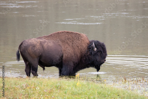 Bison Buffalo bull standing in Yellowstone River in Hayden Valley in Yellowstone National Park United States