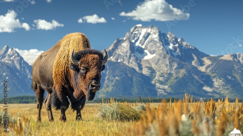 snow, fur, park, foreground, wildlife, up, bison, mammal, mountain, cloud, travel, north, grass, grazing, landscape, looking, field, standing, capped, wild, scenic, animal, sky, nature, image, horizon, yellow, green, us, summer, background, picture, close, grand, photo, tall, environment, blue, beautiful, national, america, habitat, photo, wyoming, outdoors, brown, distant