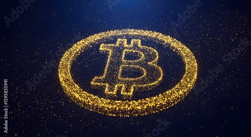 Bitcoin symbol made of interconnected golden particles against deep blue background, abstract digital art