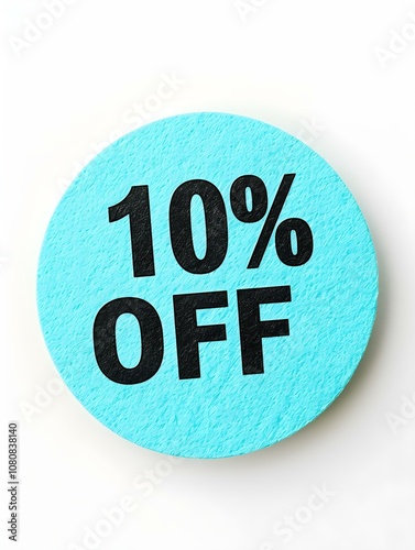 Black '10% OFF' Text on a Light Blue Round Paper Note. White Background