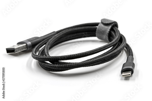 Black adapter USB to micro USB type c data and power cable isolated on white background. Closeup