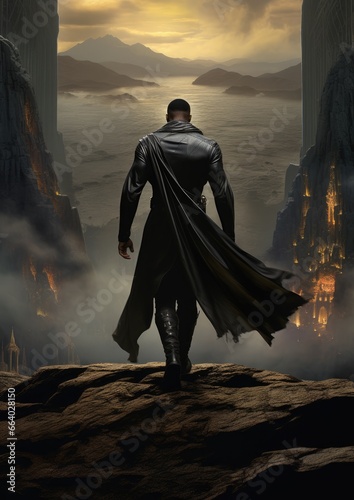 Black African american villain in black latex coat suit with a black cape. apocalypse fantasy background. Superhero, antihero, superpowers, hero, villain, rogue, fantasy action pose fiction costume.