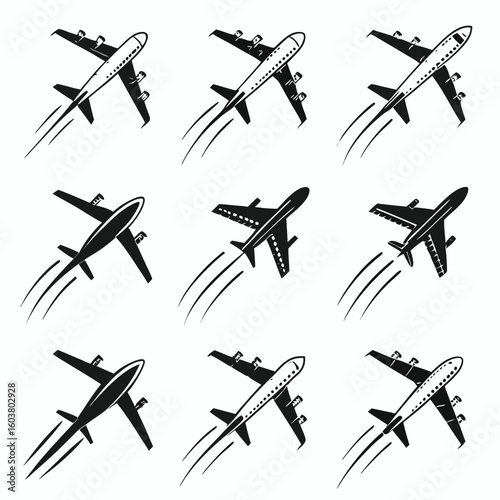 aeroplane, aircraft, jet, travel, flight, transportation, aviation, speed, movement, sky, journey, wing, engine, silhouette, graphic, icon, set, collection, black, white, modern, simple, vector, design, illustration