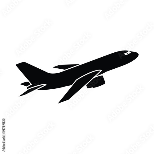 Black airplane silhouette flying right on white background symbolizing travel and transportation
