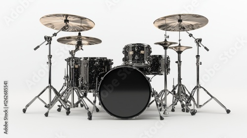 Black and silver drum set with cymbals arranged in an organized manner on a plain background