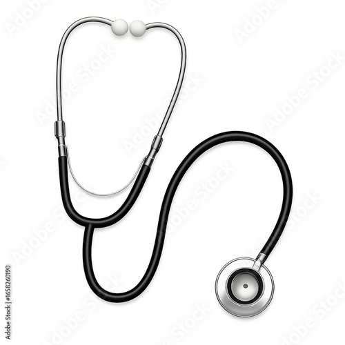 Black and silver stethoscope medical instrument isolated on black healthcare background