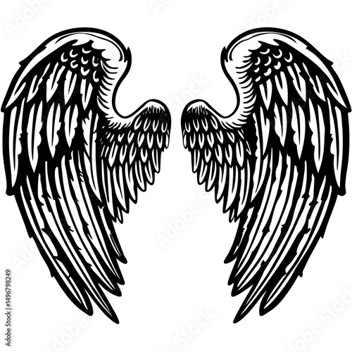 Black and white angel wings illustration in detailed style