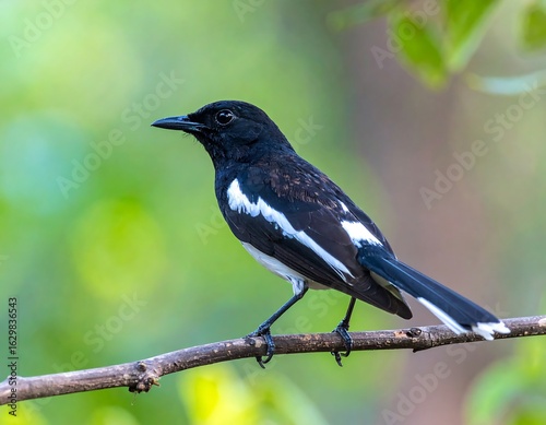 bird, black, white, perched, tree branch, nature, forest, wildlife, avian, feathered, winged, side, profile, photo, detail, sharp, sharpened, green, blurred, background, small, close, beauty, fauna, zoology, spotted, wild, animal