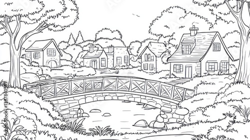 Black and white charming village scene with bridge, ideal for coloring book