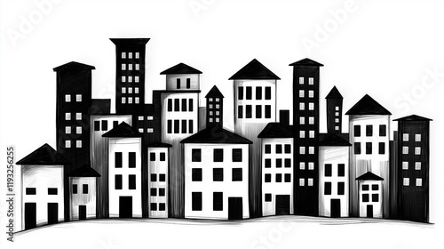 city, building, illustration, black-and-white, urban, city landscape, architecture, town, skyline, house, skyscraper, drawing, monochrome, residential, vignetting, design, graphic, simple, modern, abstract, property, neighbourhood, real estate, apartment, home, downtown, construction, business, metropolis, office, pencil drawing