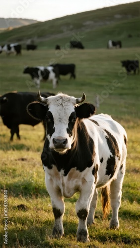 Black and White Cow Standing in a Pastoral Field with Other Cows Grazing in the Background