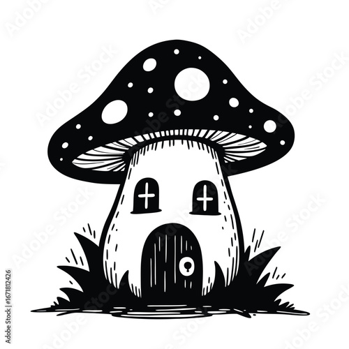 mushroom, house, drawing, black-and-white, whimsical, fantasy, fairy tale, nature, forest, cute, illustration, graphic, folklore, magic, enchanted, dwelling, home, bungalow, fairy tale, storybook, children, fantasy art, timberland, creature, abode, shelter