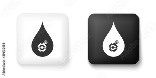 Black and white Drop with gears icon isolated on white background. Abstract concept for ecology theme, green eco energy, technology and industry. Square button. Vector.