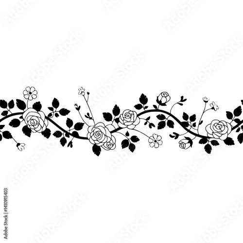 vector, floral, vine, rose, leaf, blossom, border, decoration, minimalist, elegant, graphic, design, isolated, black, white, nature, template, wallpaper, pattern, seamless, wedding, invitation, card, background, botanical, ornament