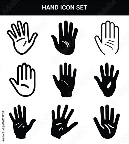 Black and White Hand Icon Set Featuring Nine Distinct Palm and Finger Illustrations