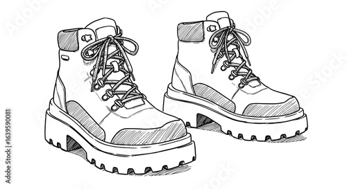 Black and white hand-drawn sketch vector illustration of hiking boots on transparent background
