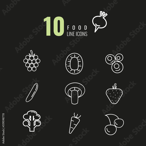 healthy, food, vegetable, fruit, vector, set, black, white, blueberry, raspberry, kiwi, cherry, broccoli, strawberry, mushroom, champignon, carrot, beet, cucumber, vegetable, collection, diet, nature, line, summer, autumn, web, icon, mobile, application, icon
